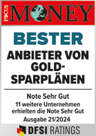 - Mehrmalige Auszeichnung des Anbieters SOLIT als „Bester Anbieter von Goldsparplänen“ (Focus Money 2016, 2017, 2018, 2019, 2020, 2021, 2022, 2023, 2024 ,2025)